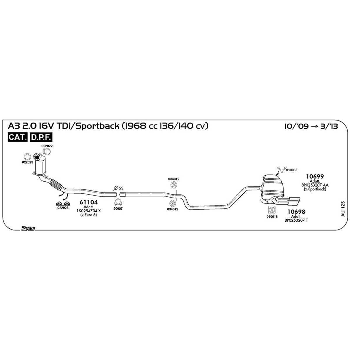 DPF Audi A3 8P1 – 8PA 2.0 16V TDI / Sportback 1968 cc 136 / 140 cv Motore CBAA / CBAB Cat DPF 10/09 -> 03/13 (61104)