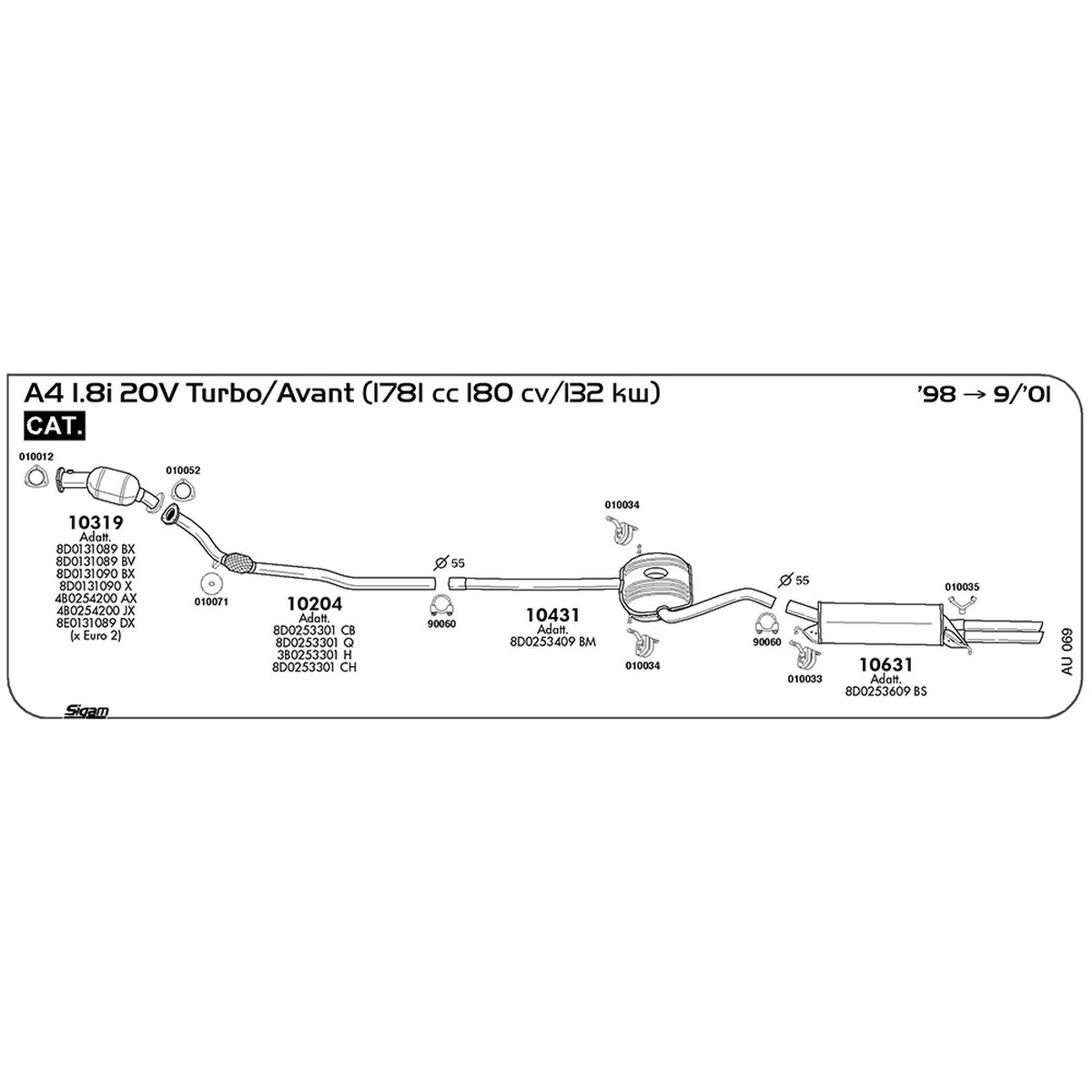 Tubo anteriore Audi A4 8D2 – 8D5 1.8i 20V Turbo / Avant 1781 cc 180 cv 132 kw Motore AJL Cat 1998 -> 09/01 (10204)